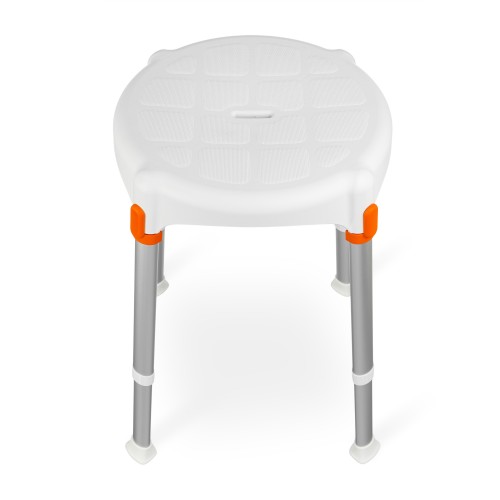 Okrogel stol za tuširanje, nastavljiv po višini. Zagotavlja dovoljšno površino za udobno sedenje, hkrati pa ne zavzame veliko prostora.